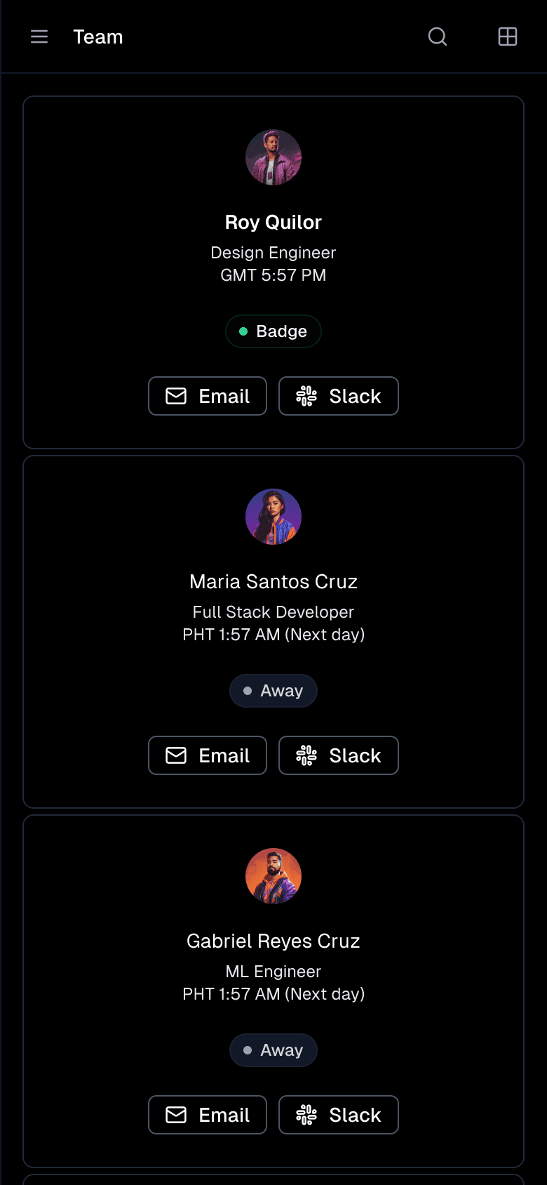 Find team contact details and time zones quickly.